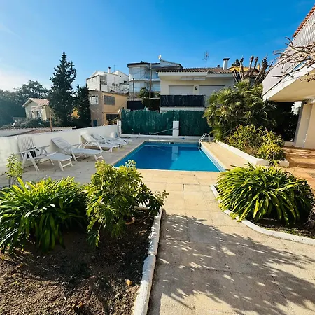 De 2-slaapkamer Exclusiva Casa Con Vistas Despejadas Al Mar Y Piscina Privada Lloret de Mar ligt op 6 km afstand van de Parochiekerk van Sant Roma en nodigt gasten uit om te ontspannen op een terras.